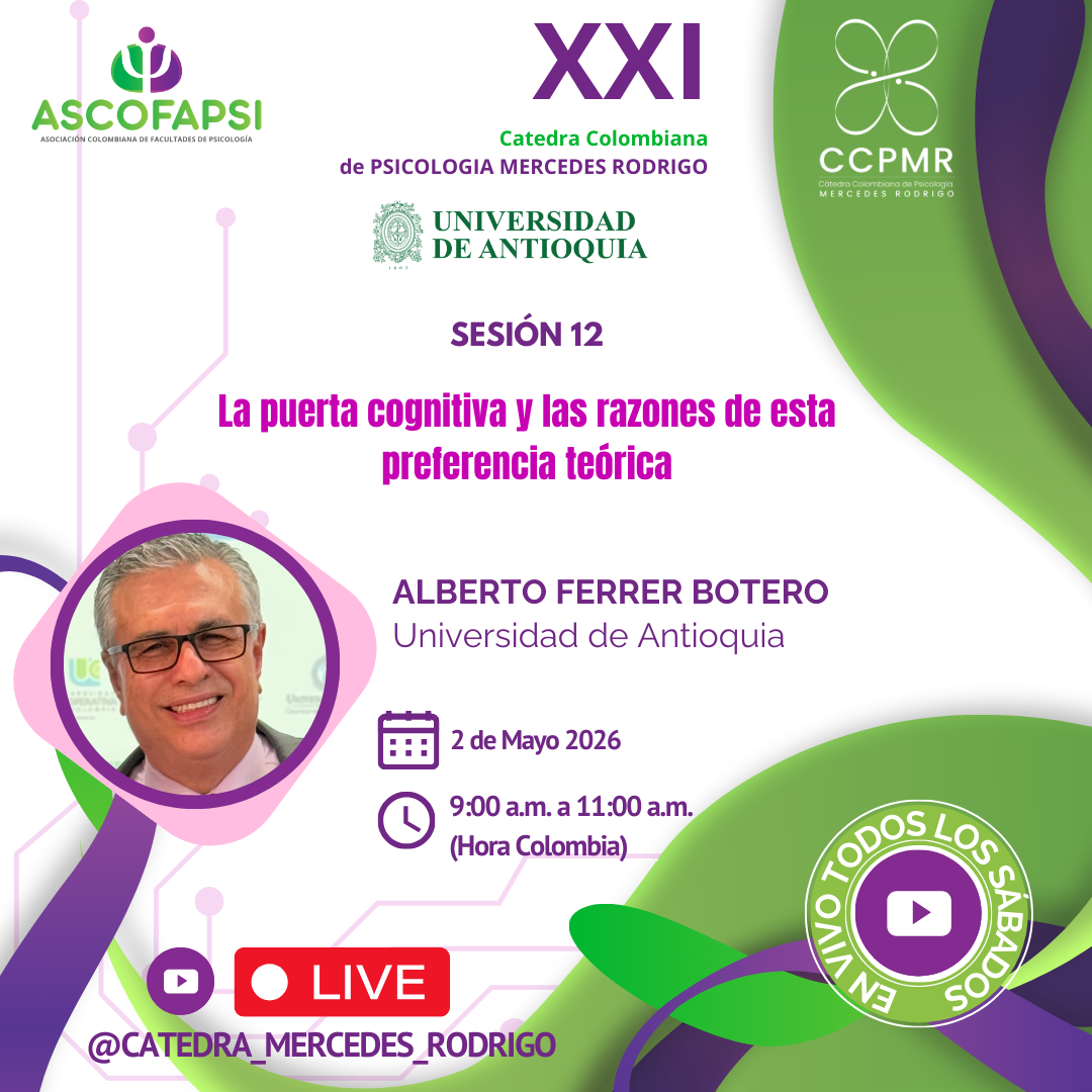 Sesión 12 0 Likes 1 Google Calendar Inicio : 2026/05/02 09:00 Fin : 2026/05/02 11:00 Sesión 12 La puerta cognitiva y las razones de esta preferencia teórica Alberto Ferrer Botero Ph.D. – Universidad de Antioquia Investigador emérito Grupo de Investigación Psicología Cognitiva