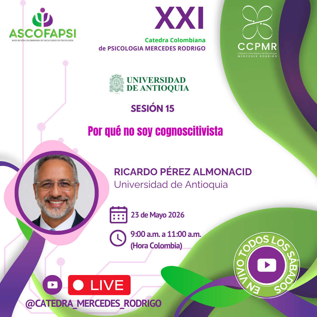 Sesión 15 0 Likes 1 Google Calendar Inicio : 2026/05/23 09:00 Fin : 2026/05/23 11:00 Sesión 15 Por què no soy cognoscitivista Ricardo Pérez-Almonacid Ph.D. – Universidad De Antioquia Departamento de Psicología
