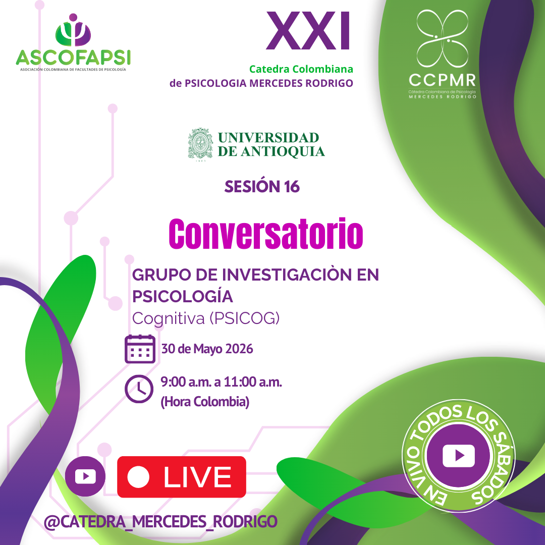 Sesión 16 0 Likes 1 Google Calendar Inicio : 2026/05/30 09:00 Fin : 2026/05/30 11:00 Sesión 16 Conversatorio GRUPO DE INVESTIGACIÒN EN PSICOLOGÍA COGNITIVA (PSICOG) – Universidad De Antioquia
