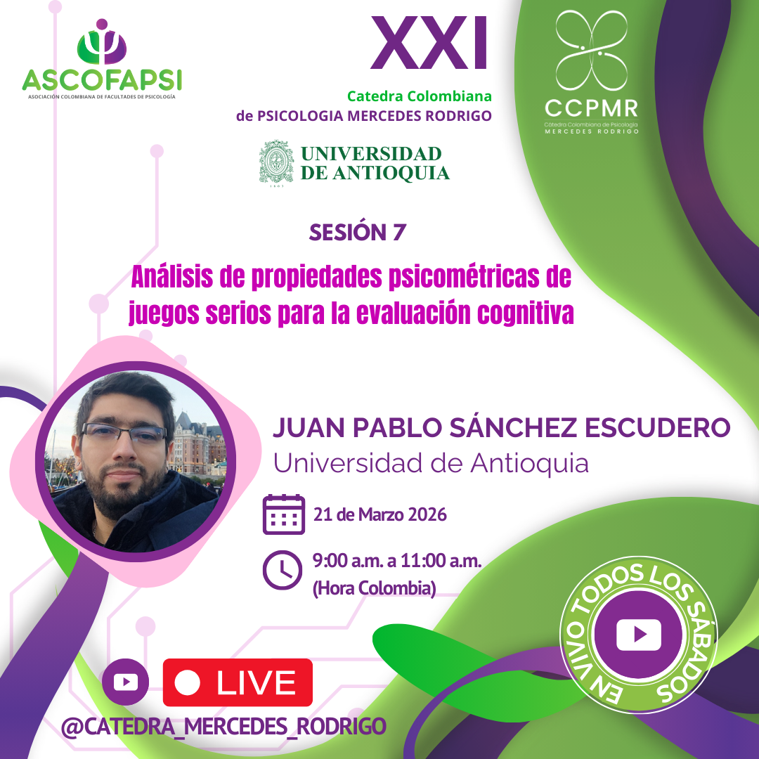 Sesión 7 0 Likes 4 Google Calendar Inicio : 2026/03/21 09:00 Fin : 2026/03/21 11:00 Sesión 7 Análisis de propiedades psicométricas de juegos serios para la evaluación cognitiva Juan Pablo Sánchez Escudero – Universidad De Antioquia